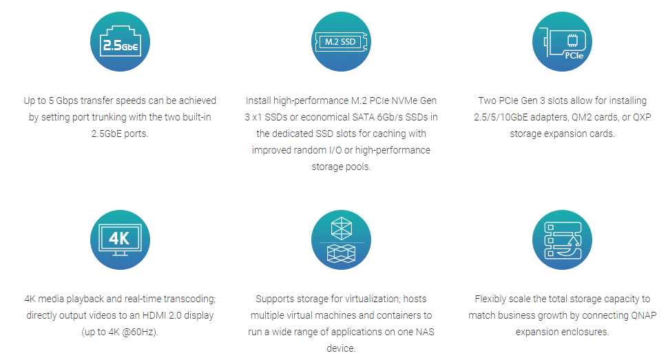 QNAP TVS-675-8G cung cấp hai khe cắm PCIe Gen 3 x4 cho phép lắp đặt các thẻ mở rộng để nâng cao chức năng của NAS (chẳng hạn như card network 2,5 / 5GbE / 10GbE hoặc card mở rộng QM2 ). Đầu ra HDMI 2.0 cho phép hiển thị trực tiếp máy ảo và đa phương tiện NAS trên màn hình hoặc TV. QNAP TVS-675-8G đáp ứng nhu cầu lưu trữ của doanh nghiệp về bảo mật, chia sẻ tệp, quản lý trung tâm, sao lưu cục bộ / từ xa / đám mây và bảo vệ ảnh chụp nhanh snapshot để hỗ trợ các công việc hàng ngày với năng suất cao hơn. Trung tâm ứng dụng được tích hợp sẵn nâng cao sức mạnh cho các ứng dụng NAS, chẳng hạn như lưu trữ nhiều máy ảo và vùng chứa containers, triển khai lưu trữ đám mây, xây dựng hệ thống giám sát video, sao lưu dữ liệu với project S3 và hơn thế nữa.